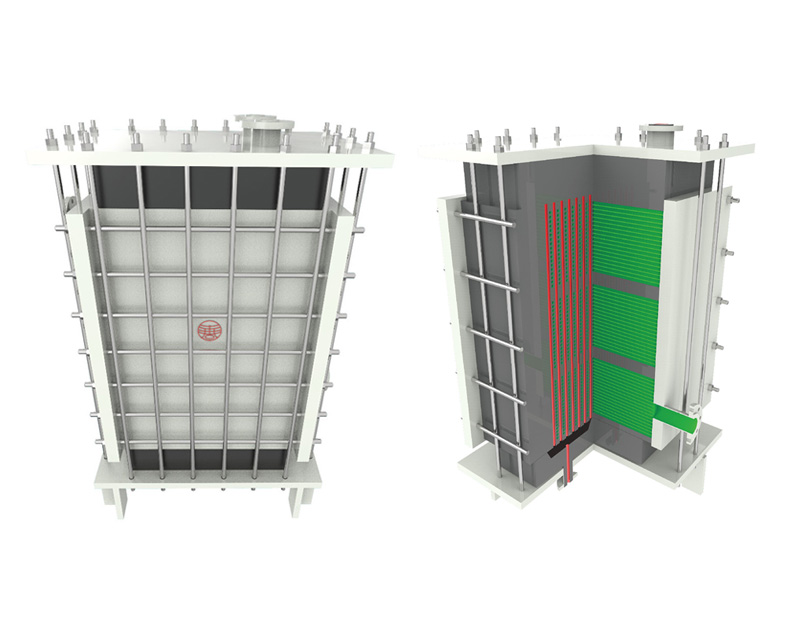 矩形塊孔換熱器有矩形石墨封頭、石墨換熱塊及其間的密封墊片等迭裝組成。因換熱塊僅承受壓力并為整體結(jié)構(gòu)、無(wú)膠結(jié)縫,因而結(jié)構(gòu)強(qiáng)度較高,抗沖擊性良好。 水封側(cè)板為鑄鐵板,檢修裝拆簡(jiǎn)便。也可制成雙向防腐結(jié)構(gòu)。 該設(shè)備可作加熱器、冷卻器、冷凝器,物料流程為1~4個(gè)流程。